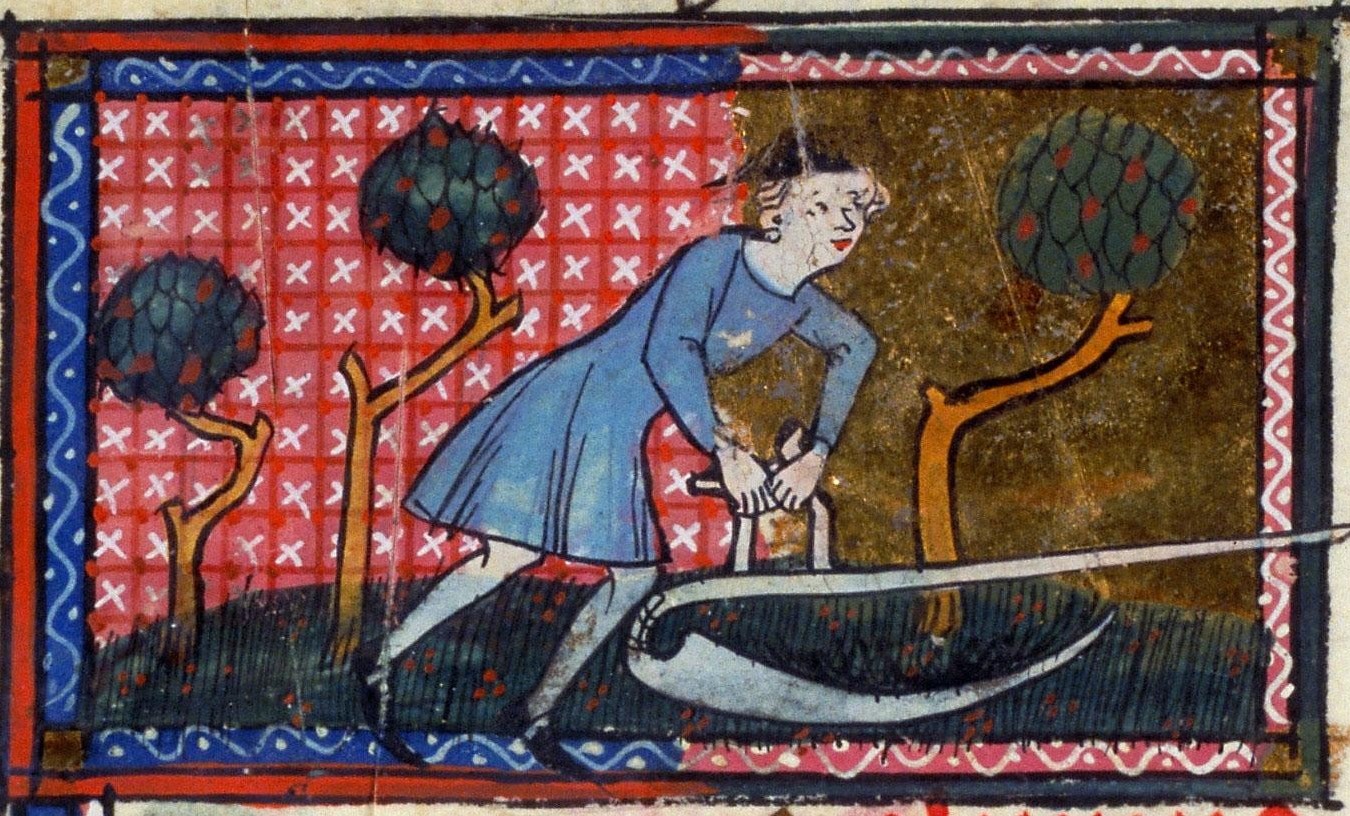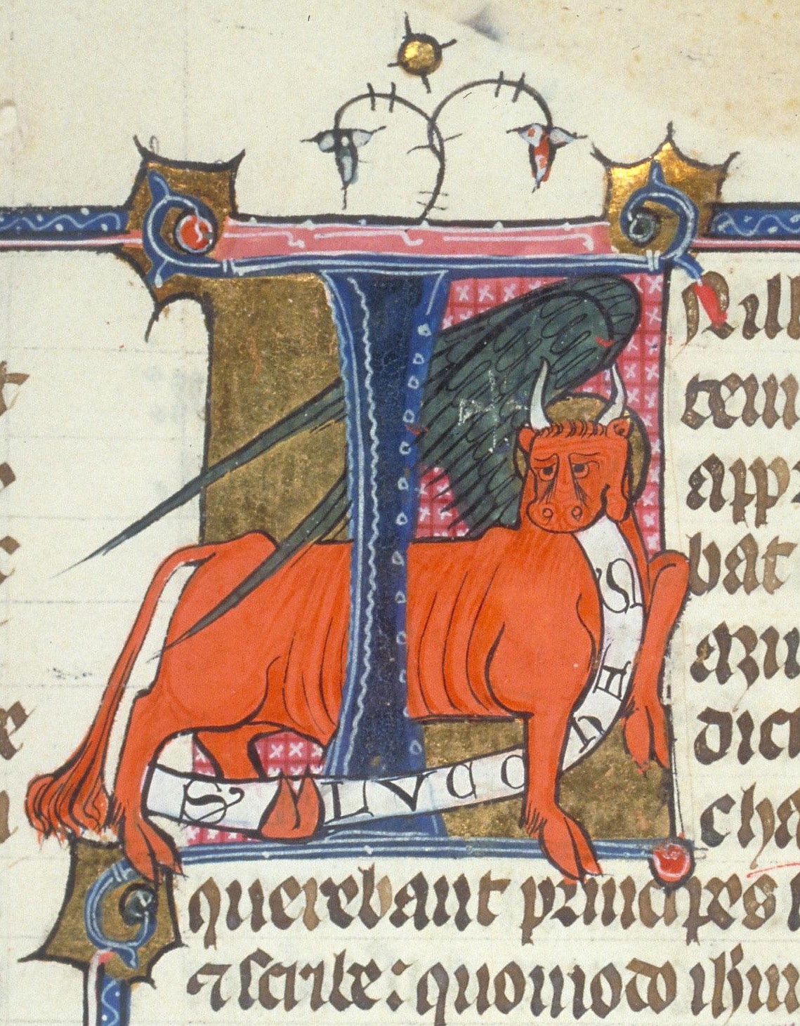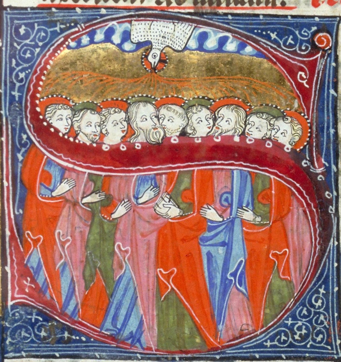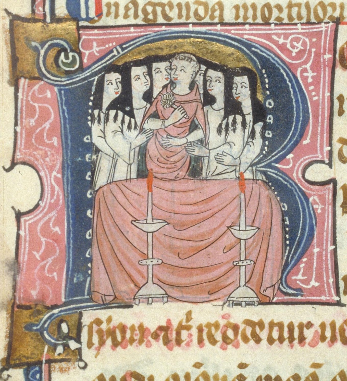 Enluminures et décors du ms. 91 de la Bibliothèque de Toulouse, missel de Bernard Galinier, fol. 2v (jeune homme aux fleurs), 3v (fenaison), 5 (vendange), 90v (boeuf de saint Luc), 121 (Trinité), 139 (Pentecôte), 256 (office funèbre)
