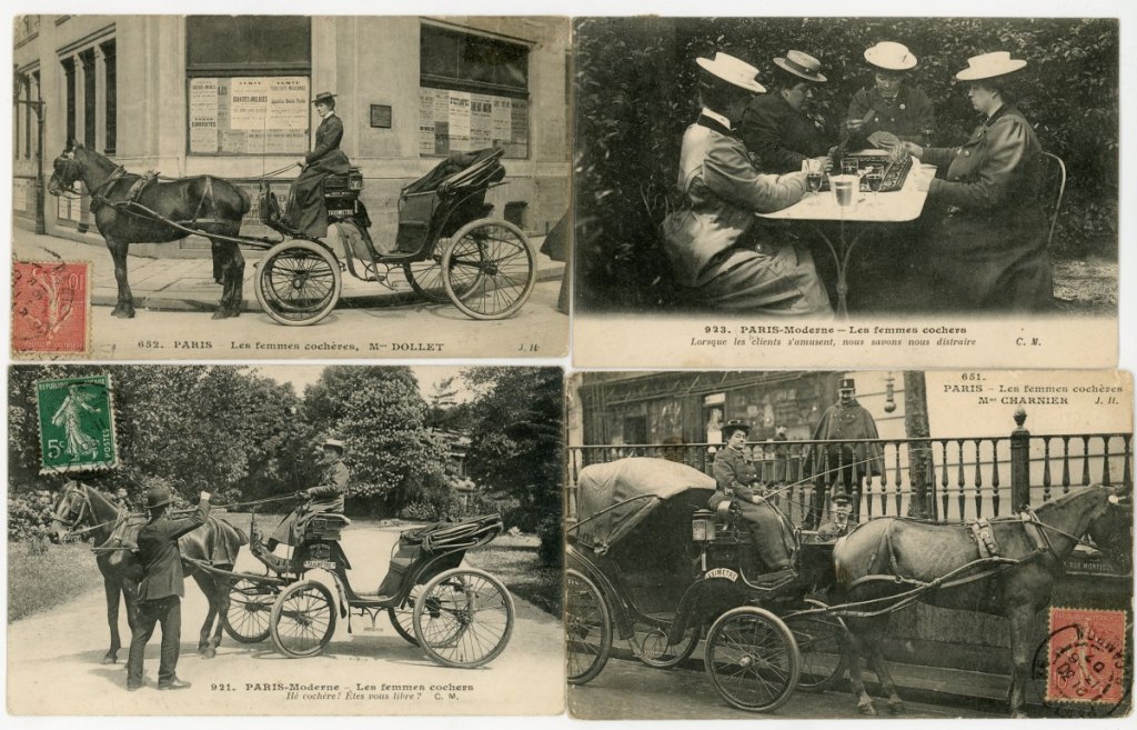 Au départ de ce livre et comme un fil tissé tout au long de l’ouvrage et du projet qu’il recouvre, il y a une situation particulière, qui a suscité la curiosité et l’intérêt de l’autrice, celle des cochères. Les premières cochères investissent la profession, ce qui suscite entre la fin 1906 et la mi-1907 un écho médiatique considérable (dans la presse, via les cartes postales).