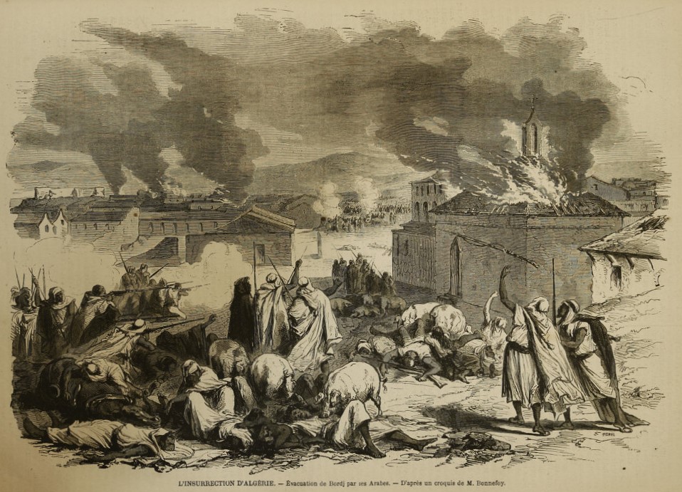 Rappel. Contexte. La révolte de Mokrani, appelée aussi insurrection de 1871 : la plus importante insurrection contre les forces coloniales françaises depuis la conquête d’Alger, en 1830. Lancée à la mi-mars 1871 (a lieu au même moment que la Commune de Paris). Révolte menée depuis la Kabylie. Après la défaite militaire contre la Prusse, aux tous débuts de la IIIe République. Révolte réprimée dans les semaines et les mois qui suivent. Jugements, emprisonnements, déportations à Cayenne et en Nouvelle Calédonie. Et puis contributions de guerre.