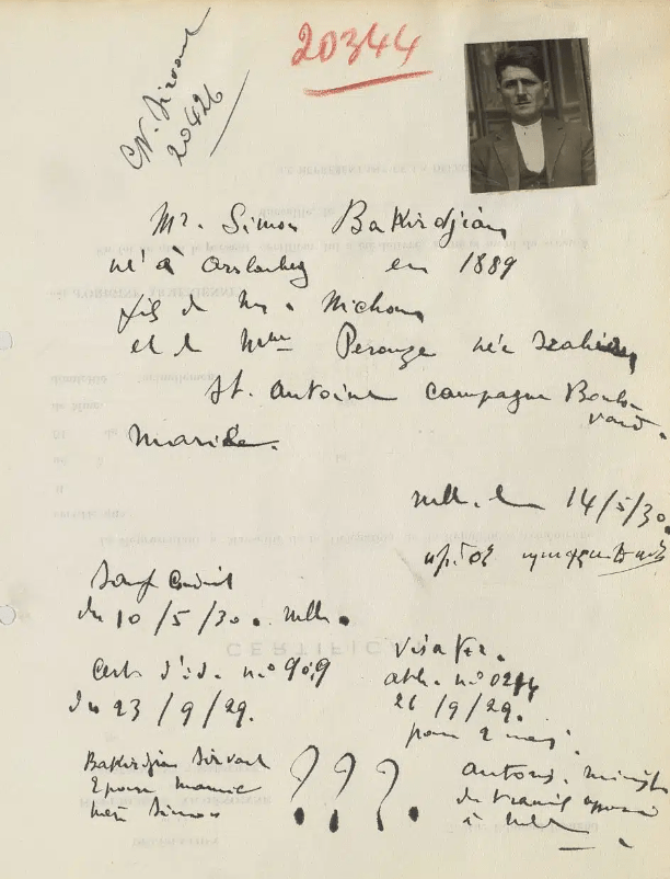 Présentation de la documentation. Certificats émis entre 1929 et 1941, pour la plupart par l’Office des réfugiés arméniens, bureau de Marseille. Ces certificats tirent leur existence des mesures d’exclusion mises en œuvre dans les pays d’origine, en Russie soviétique, dans la Turquie kémaliste ensuite vis-à-vis des Arméniens. Rescapés et réfugiés du génocide de 1915. Après l’espoir de l’avènement d’une Arménie indépendante à l’est de la Turquie, l’affaire est entendue en 1923 et avec le traité de Lausanne, en 1924. Office des réfugiés arméniens, antenne de Marseille. Référence : le décret du 11 janvier 1930, fruit d’un « arrangement intergouvernemental » émis à Genève, le 30 juin 1928 (arrangement qui reprend des résolutions analogues adoptées à Genève en 1926, en 1924 et en 1922). Explications (l’apatridie et l’intégration au dispositif conçu par la SDN pour donner un statut aux dénaturalisés de l’Empire russe puis aux Arméniens). Offices de réfugiés placés sous la tutelle de la SDN tout en s’emboîtant dans les rouages de l’administration du pays d’accueil. Délivrance de « certificats d’identité et de voyage », connus sous le nom de « passeports Nansen ». L’office de Marseille et son organisation.