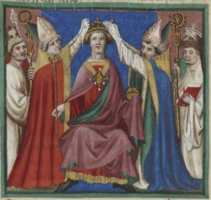 Enluminures extraites du ms. fr. 2608 de la Bibl. nat. de France (fol. 481v, 483v et 521v) : siège de Reims (1359-1360), traité de Brétigny (1360) et couronnement de Richard II (1377)