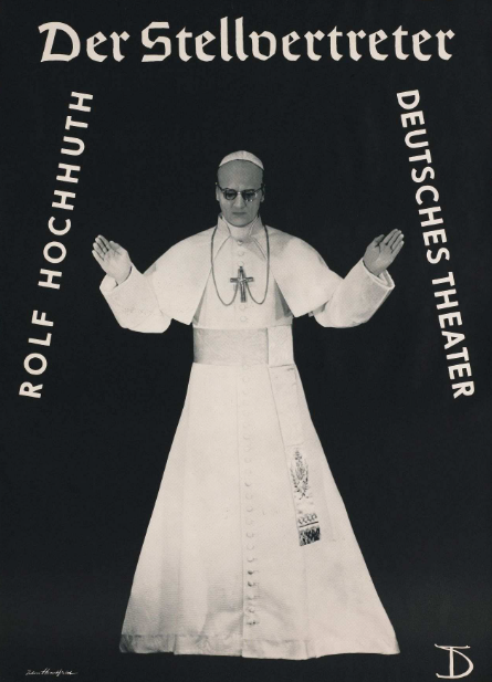 Le pape Pie XII, photographié vers 1940 par Gitta Carell ; le pape le 7 juin 1944 ; édition de la pièce de théâtre de Rolf Hochhuth, Der Stellvertreter (Le Vicaire), parue initialement en 1963 et qui critique l’action du pape Pie XII pendant la Seconde Guerre mondiale ; extraits d’un éditorial de Combat, 26 décembre 1944, éditorial signé Albert Camus
