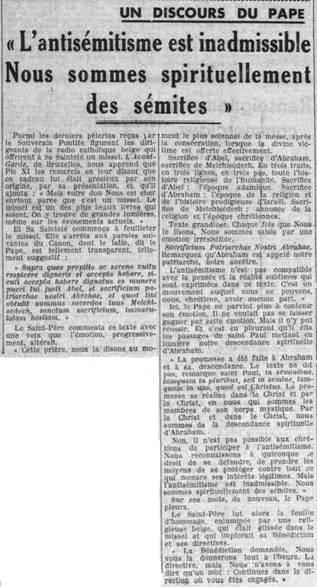 Déclaration du pape Pie XI, parue dans la presse en 1938 (ici un article publié dans La Croix le 17 septembre 1938)