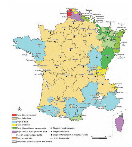 Retour sur la construction historique de l’administration fiscale et des territoires du fisc (1). Regardons d’abord la carte des pays et régimes d’administration fiscale en 1778 (carte 2, p. 26). La carte figure les limites de « généralités », porte les sièges de recette générale et d’intendance et distingue six catégories majeures : pays de gouvernement, pays d’élections, pays d’états, pays syndiqués, pays d’imposition ou pays conquis, pays conquis ayant gardé des états, bref ce « royaume très imparfait, très rempli d’abus et tel qu’il est impossible à gouverner », comme l’affirme Charles Alexandre de Calonne en 1786. Opposition entre pays d’élections et pays d’états, explication, origines et genèse de cette opposition.