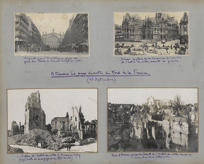 Quelques réflexions (1). Le mariage et la lune de miel. Les six photographies du mariage dans l’album. Profil des deux mariés. Le voyage de noces et sa pratique. Le départ immédiat. Itinéraire. Sur les traces du passé de chacun. Sur les traces de la Grande Guerre. Dark Tourism. Périple de Gérald et de Berthe dans les régions dévastées. A l’allure du train, le spectacle des ruines. Mise en scène de la désolation dans l’album. Une idée exceptionnelle ? Cinq autres voyages de noces des lendemains de guerre ayant pour destination les champs de bataille ont été retrouvés par l’autrice (p. 100).