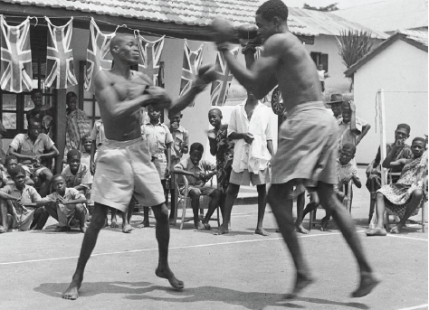 Combat de boxe au centre communautaire d’Asamankese (Gold Coast, Ghana, vers 1940-1950) et Elèves du prestigieux Achimota College sur un terrain de sport (Ghana, vers 1955), Jeu de rôle d’une troupe des scouts catholiques de Côte d’Ivoire à Abidjan (vers 1975), photographies reproduites dans le livre de Claire NIcolas, p. 62, 99 et 244