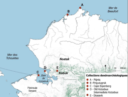 Source majeure : vestiges en bois. Le Nord-Ouest de l’Alaska est une région favorable aux analyses dendrochronologiques à résolution annuelle. Rappel : qu’est-ce que la dendrochronologie ? Qu’est-ce que l’analyse dendrochronologique ? La dendrochronologie pratiquée depuis les années 1940 en Alaska (James Louis Giddings) avant d’être reléguée. Sites archéologiques côtiers abritent des bois qui proviennent de diverses régions d’Alaska (bois flotté). L’objet de la recherche est donc bien d’affiner le cadre chronologique et climatique des transformations culturelles du début du IIe millénaire de notre ère par l’analyse des signaux dendrochronologiques et dendroclimatiques d’un large ensemble de bois archéologiques. Renouveler le cadre chronologique et climatique de cette période afin de pouvoir, par la suite, questionner les dynamiques socio-environnementales des groupes Punuk, Birnirk et Thulé.
