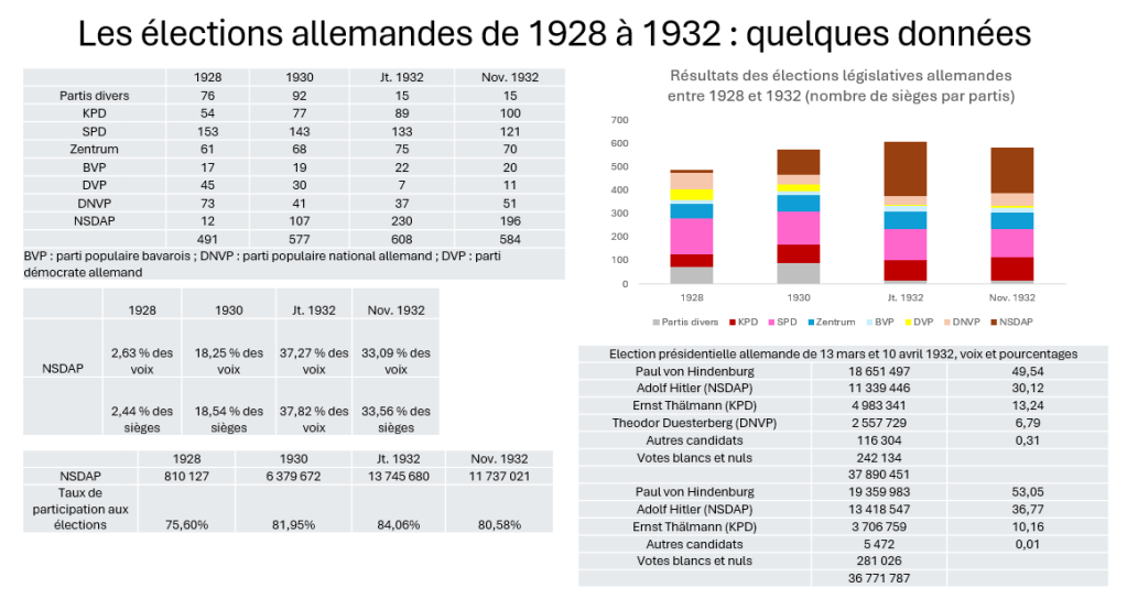 Partir de quelques données pour bien comprendre les enjeux et la portée du livre. Les résultats des élections allemandes. Le recul du SPD, le poids croissant du KPD. Le Zentrum. A droite de l’échiquier politique : en particulier, le DNVP et le NSDAP. Augmentation spectaculaire en nombre de sièges et en nombre de voix. Explosion aux élections de septembre 1930, apogée à celles de juillet 1932, recul ensuite (de 37 à 33 % des voix). Une ascension résistible (voir Der aufhaltsame Aufstieg des Arturo Ui, pièce écrite en 1941 en Finlande par Bertolt Brecht).