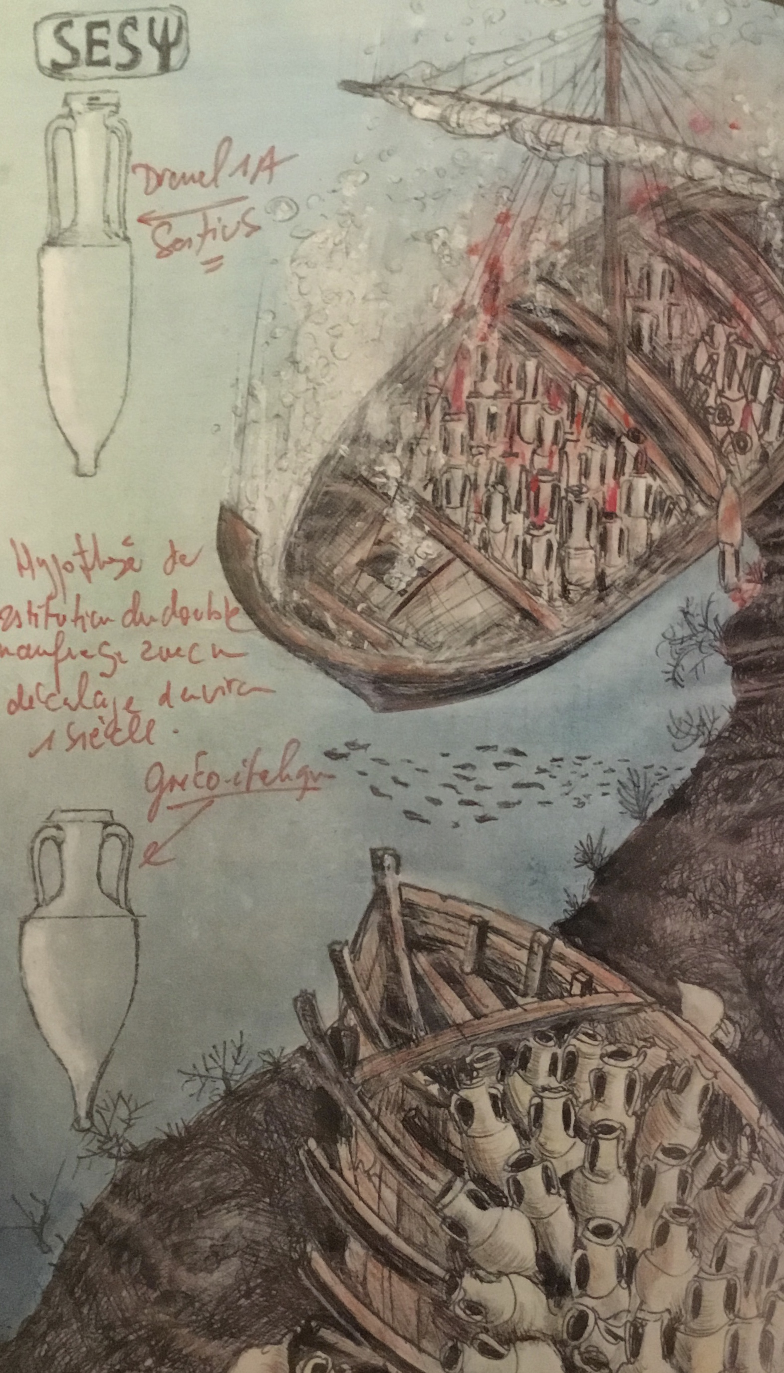 Dessin de Luc Long représentant le double naufrage (épaves du Grand Congloué, près de Marseille, IIe-Ier siècle avant Jésus-Christ), années 1980, et ex-voto d’intestins et d’enfants en langes datant du IVe siècle avant notre ère