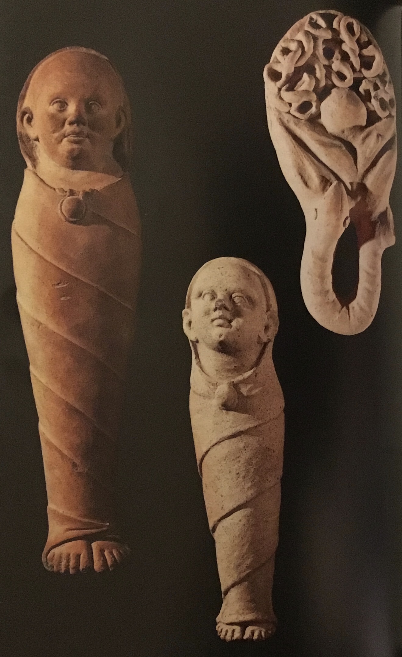 Des sources et… des images. Un livre qui est un immense cahier iconographique. Deux choix (parmi d’autres !) : un dessin (années 1980) de Luc Long (p. 574), conservateur en chef au Département des recherches archéologiques subaquatiques et sous-marines (DRASSM, structure créée en 1966 et implantée à Marseille), dessin représentant le double naufrage survenu au début du IIe s. av. JC puis dans les premières années du Ier s. av. J.-C., près de l’îlot du Grand Congloué, non loin de Marseille (fouilles dans les années 1950, sous la houlette de Fernand Benoit et avec le commandant Cousteau dont on possède des dessins, voir p. 621, puis dans les années 1980) ; des ex-voto d’intestins et d’enfants en langes provenant de Tessennano, à Vulci et datant du IVe siècle avant notre ère (voir p. 548, les dédicants offrent dans le sanctuaire une reproductin de l’organe dont ils ont obtenu la guérison grâce à la divinité).