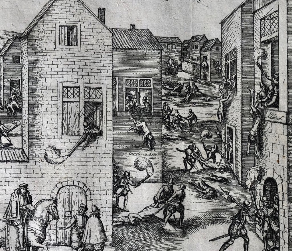 Dimanche 24 août : aux petites heures, Coligny et une vingtaine de nobles sont assassinés ; le tocsin se met à sonner (Saint-Germain-l’Auxerrois, horloge du palais de justice), commence ce qu’on a parfois appelé « la seconde Saint-Barthélemy, celle du peuple de Paris » (Arlette Jouanna, La Saint-Barthélemy. Les mystères d’un crime d’Etat, 24 août 1572, Gallimard, 2007, p. 152) ; environ 3000 réformés seront assassinés à Paris, le 24 août et les jours suivants